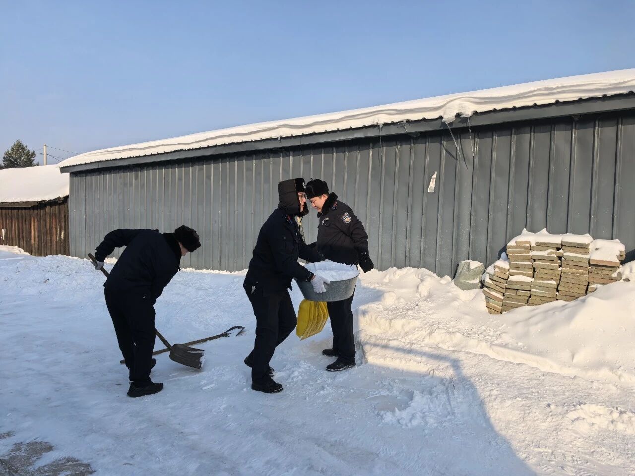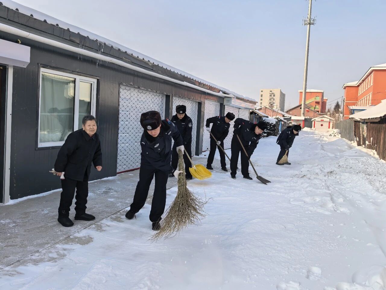 民辅警们带着铁锹、扫帚,逐一走访辖区孤寡老人住所。到达老人家中后,大家顾不上严寒,立即分工协作,铲积雪、除冰碴儿、清路面,重点对老人家门口、院落通道、台阶等处的积雪冰面进行细致清理,不放过一处安全隐患。