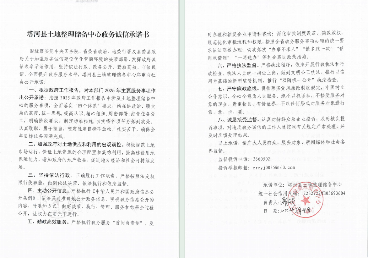 2025年塔河县土地整理储备中心政务诚信承诺书