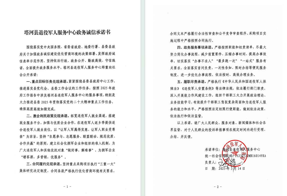 2025年塔河县退役军人服务中心政务诚信承诺书