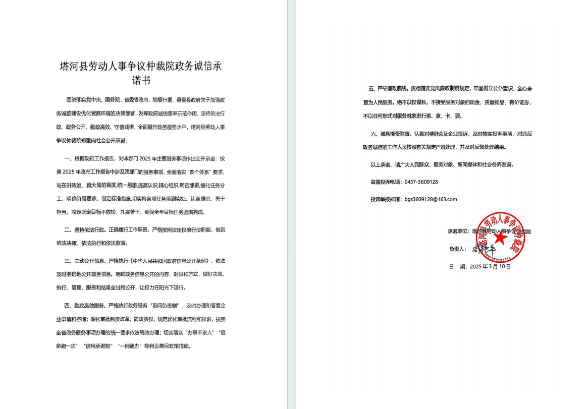 2025年塔河县劳动人事争议仲裁院政务诚信承诺书