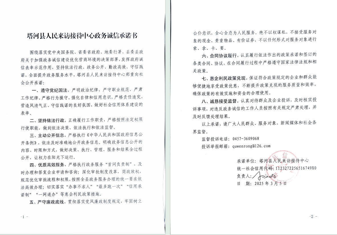 2025年塔河县人民来访接待中心政务诚信承诺书