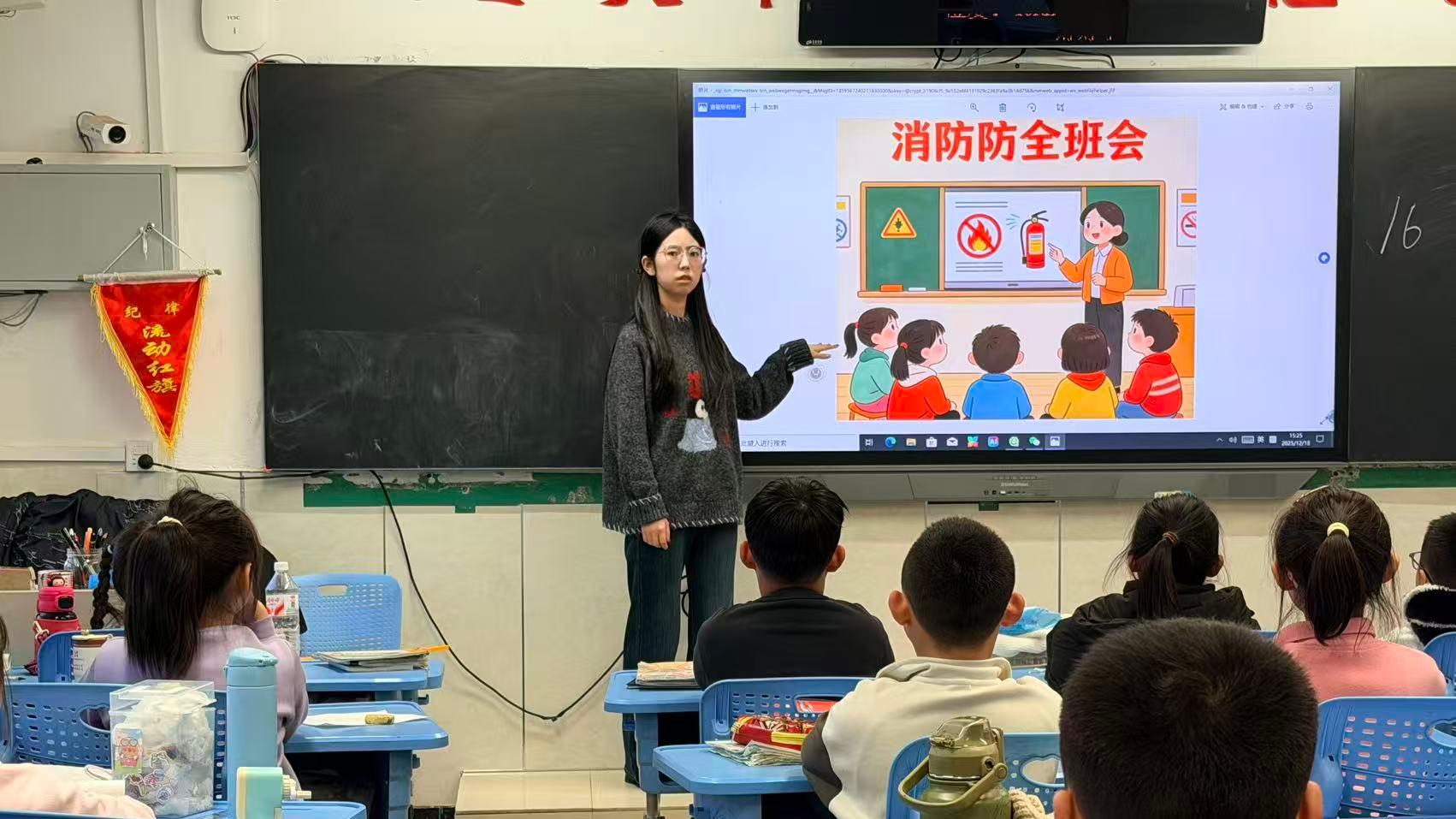 校领导与中层干部率先开展安全隐患大排查,重点覆盖教室、实验室等关键区域;各班主任同步在班级内细致排查,严禁打火机、火柴等易燃易爆物品入校,从源头筑牢安全防线。校园电子屏滚动播放防火警示标语,全方位营造浓厚安全氛围;各班级召开主题班队会,通过生动讲解、案例分析等形式,向学生普及防火常识及逃生自救技能。学校也同步组织教职工开展消防安全专项培训,强化应急处置专业能力,会上专门对教职工进行了无烟校园安全提醒,明确校园全面禁烟要求,引导全体教职工以身作则,共同守护校园安全环境。