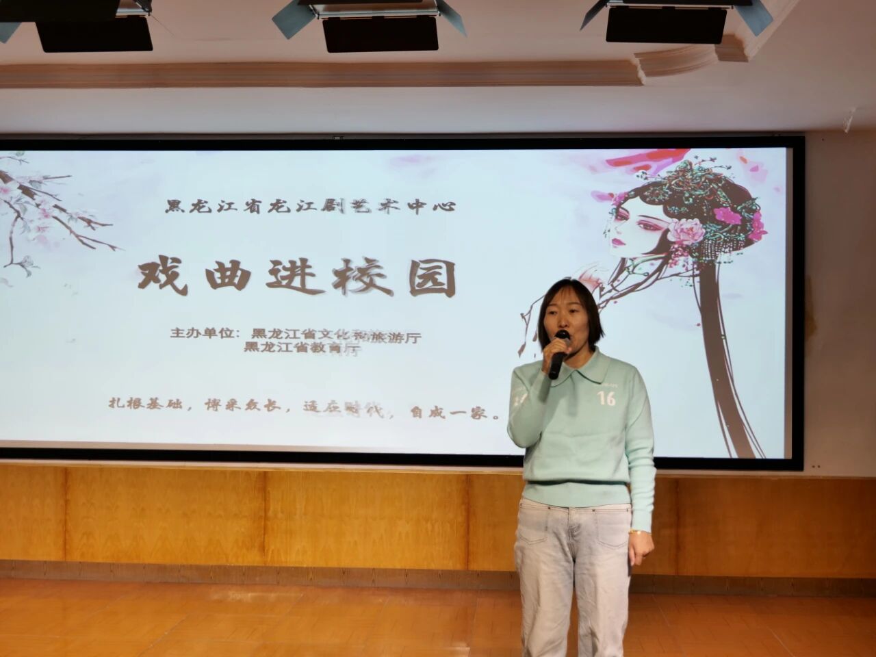 演员们现场演绎《丢手绢》《折扇》等龙江剧的经典技艺片段,并邀请学生们走上台前,亲身感受龙江剧的表演技巧,沉浸式体验传统戏曲的乐趣。此次活动将专业戏曲资源引入校园,搭建起传统艺术与青少年群体之间的沟通桥梁,为校园艺术教育注入新活力,让非遗文化在青少年心中播下传承的种子。