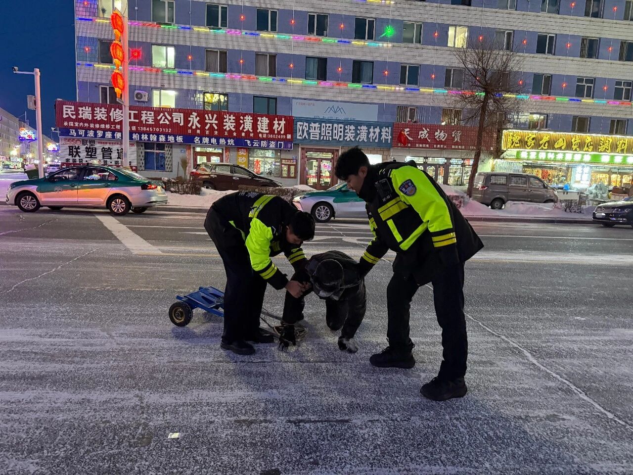 近日,塔河县公安局交通管理大队民警在巡逻途中快速反应,及时救助一名在冰雪路面摔倒的老人,有效避免了交通隐患,保障了群众安全。