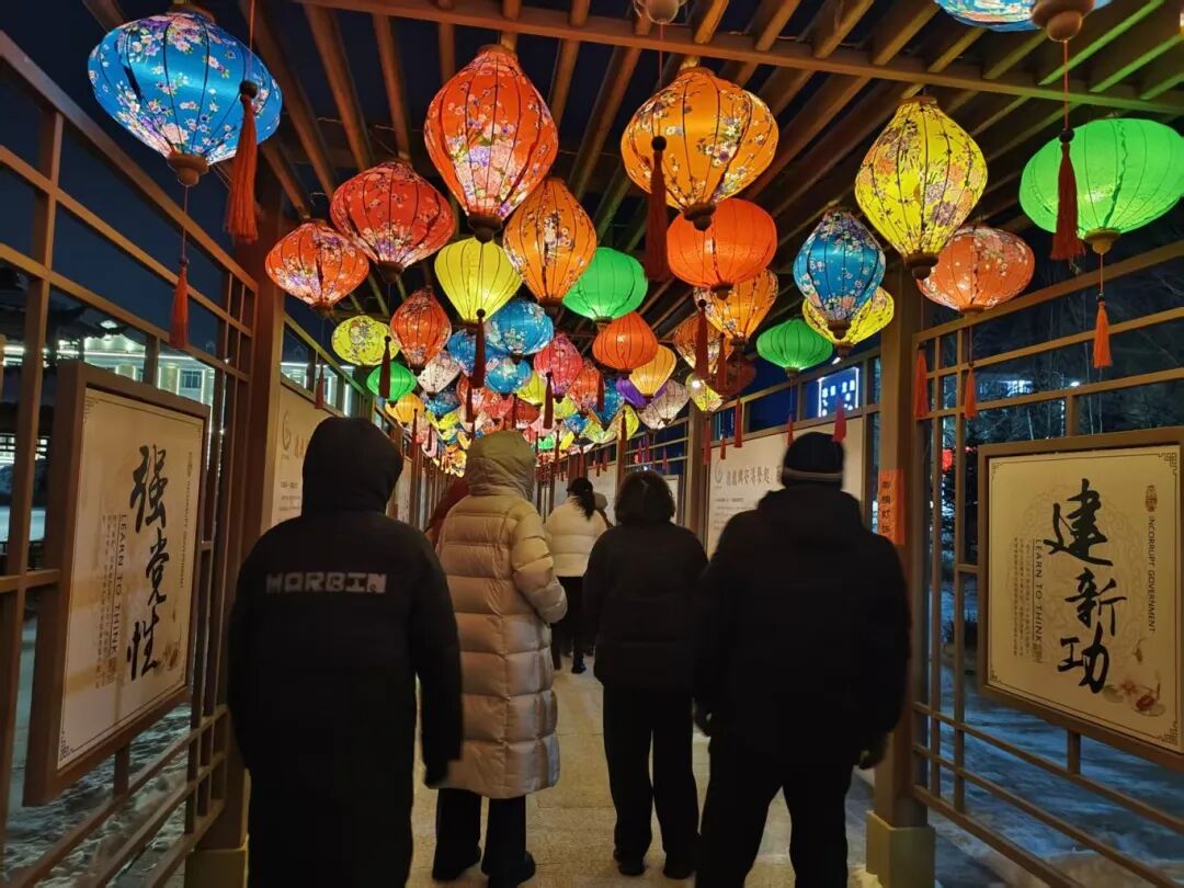 傍晚时分,原本普通的长廊摇身一变,成为流光溢彩的花灯世界。百余盏花灯悬挂于长廊内,错落有致、既保留了传统民俗韵味,又融入了喜庆吉祥的美好祝福。居民们结伴前来漫步赏灯、拍照打卡,定格美好瞬间,邻里间驻足交谈,互道节日祝福,暖意融融,大家纷纷表示,在家门口就能欣赏到如此美景,节日的氛围更加浓厚了。