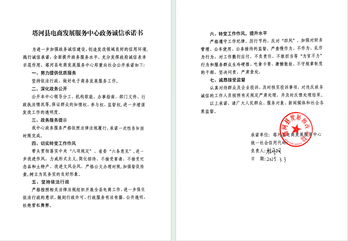 2025年塔河县电商发展服务中心政务诚信承诺书