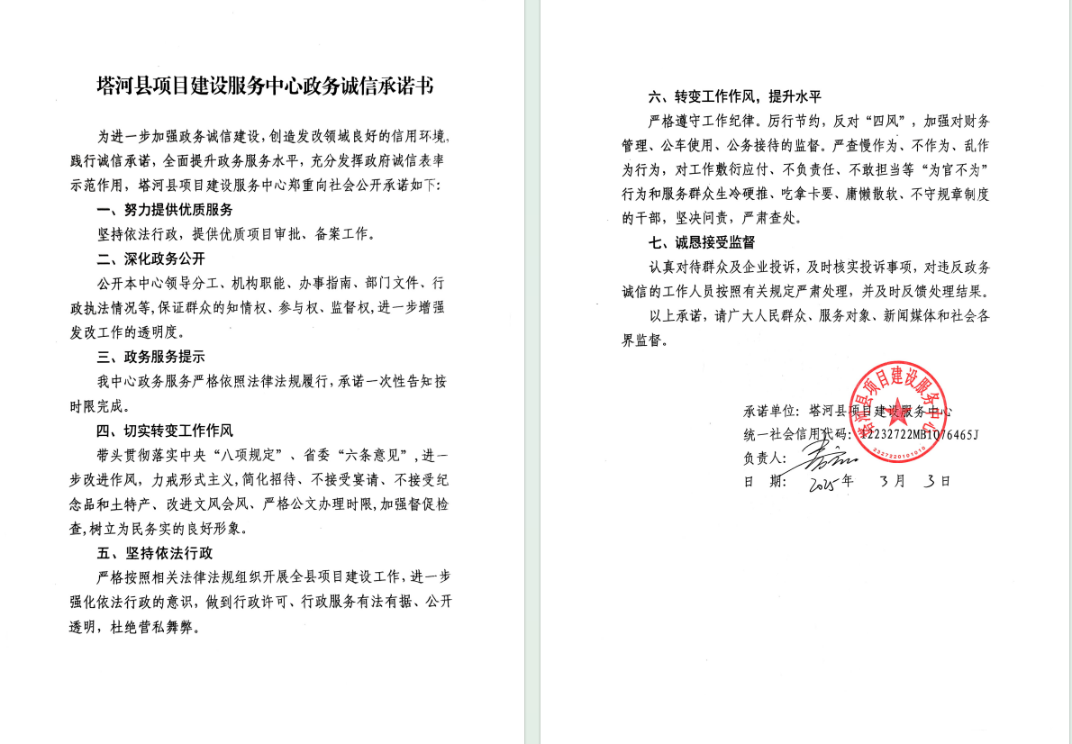 2025年塔河县项目建设服务中心政务诚信承诺书