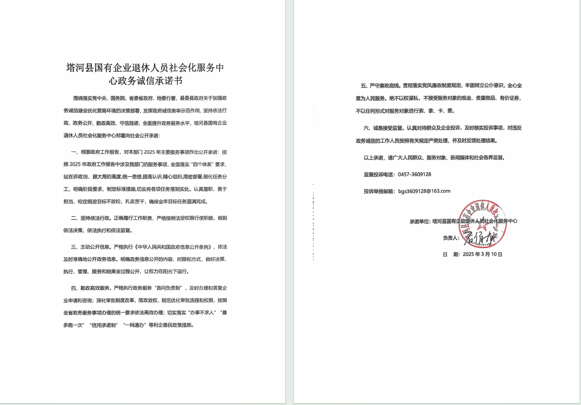 2025年塔河县国有企业退休人员社会化服务中心政务诚信承诺书