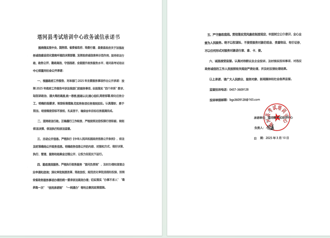 2025年塔河县考试培训中心政务诚信承诺书